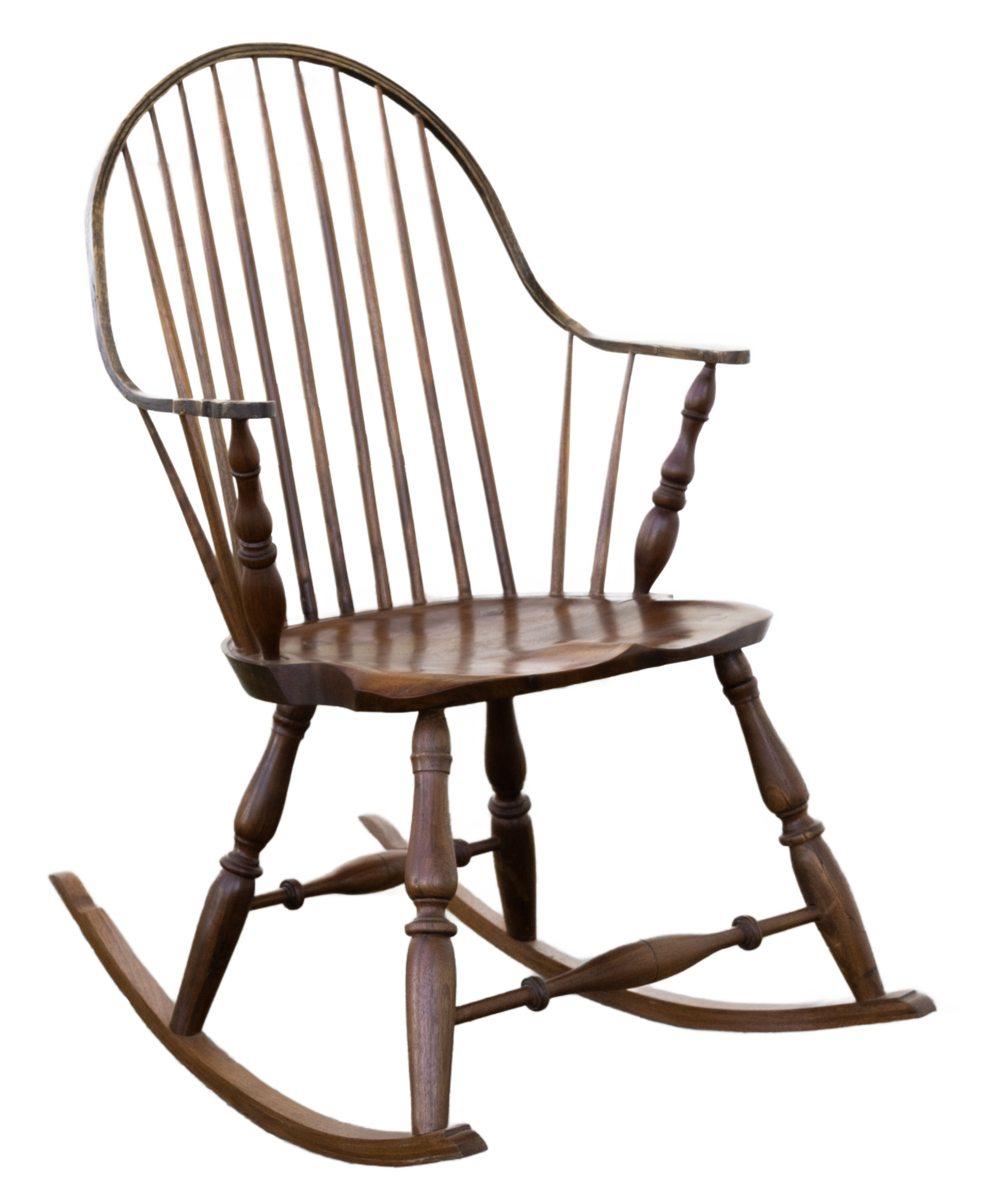 Regnery uses different types of wood for his Windsor chairs: cherry, walnut, maple, hickory and ash, mostly cut locally. He finishes the chairs with linseed or tang oil, shellac and bees wax, similar to the way chairs were finished in the 18th century.