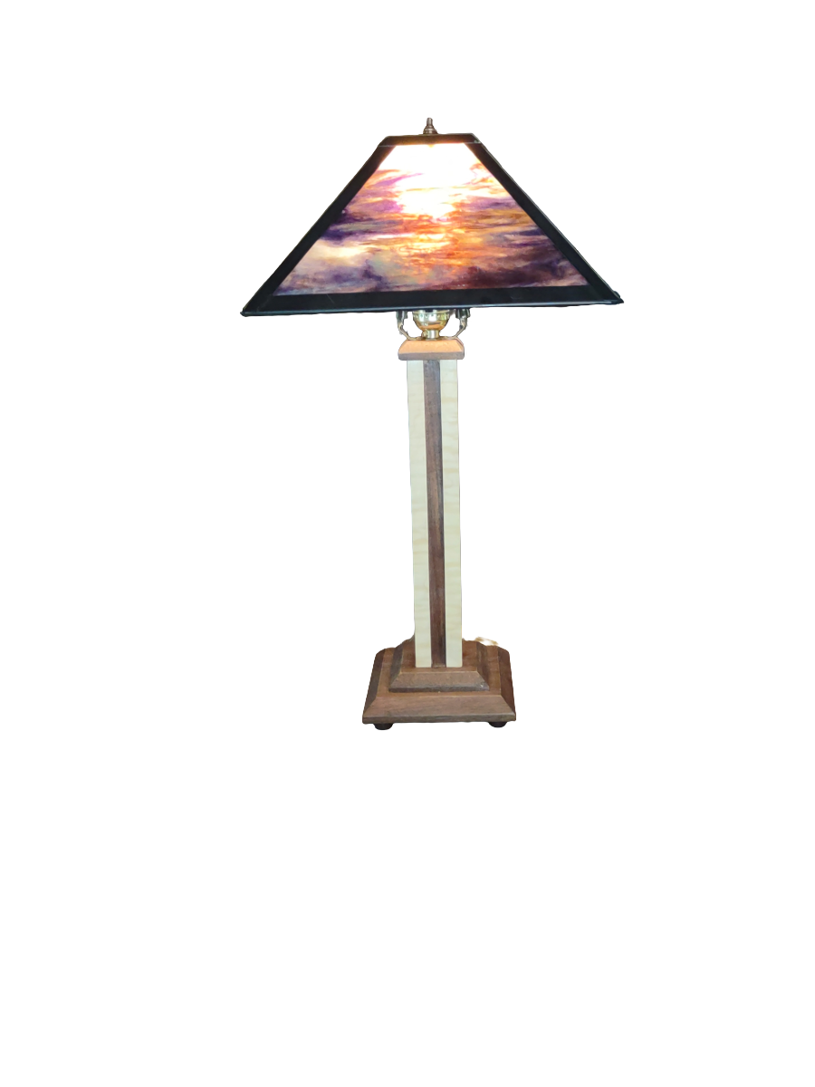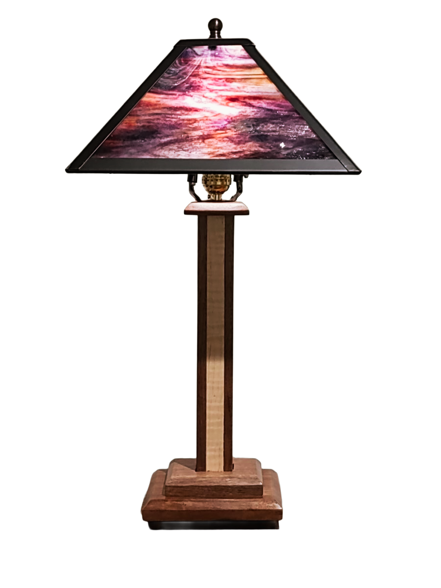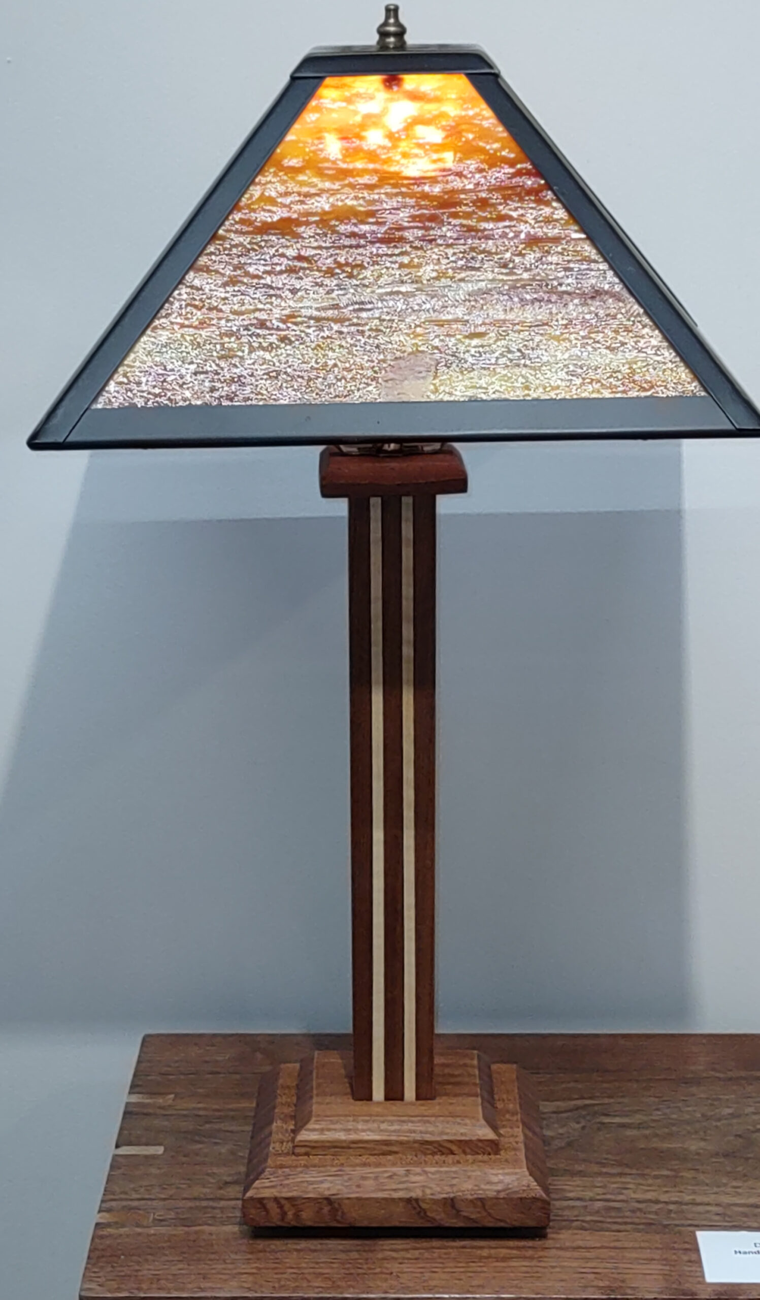 He attended a two-week intensive course at the Center for Furniture Craftsmanship in Rockport, Maine. To develop his woodworking skills, he reconfigured an outbuilding on his property to become a woodshop. Since 2016, he has tried his hand at a number of projects including: pedestal for sculpture; work table with pull-out keyboard tray, bedside tables; hall entry table; book rests; side tables; and charcuterie boards. He fell into making wooden lamps with stained glass shades when his younger daughter asked him to build her two bedside tables. When completed, he thought that what those tables really needed was two lamps to go on them.