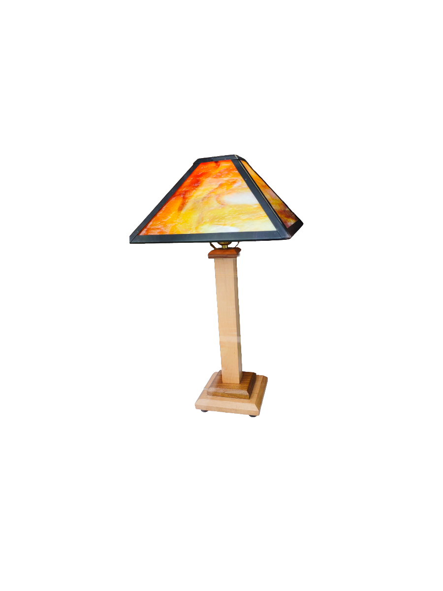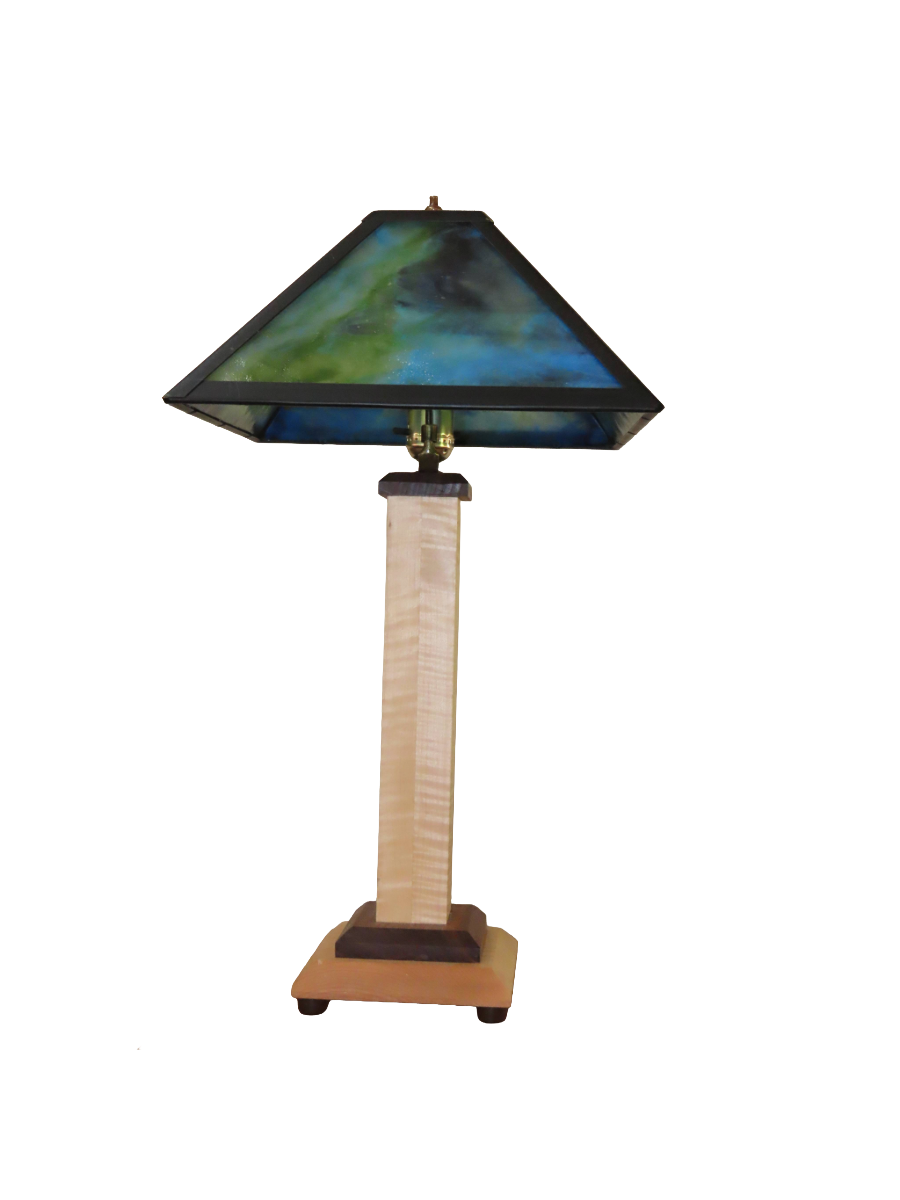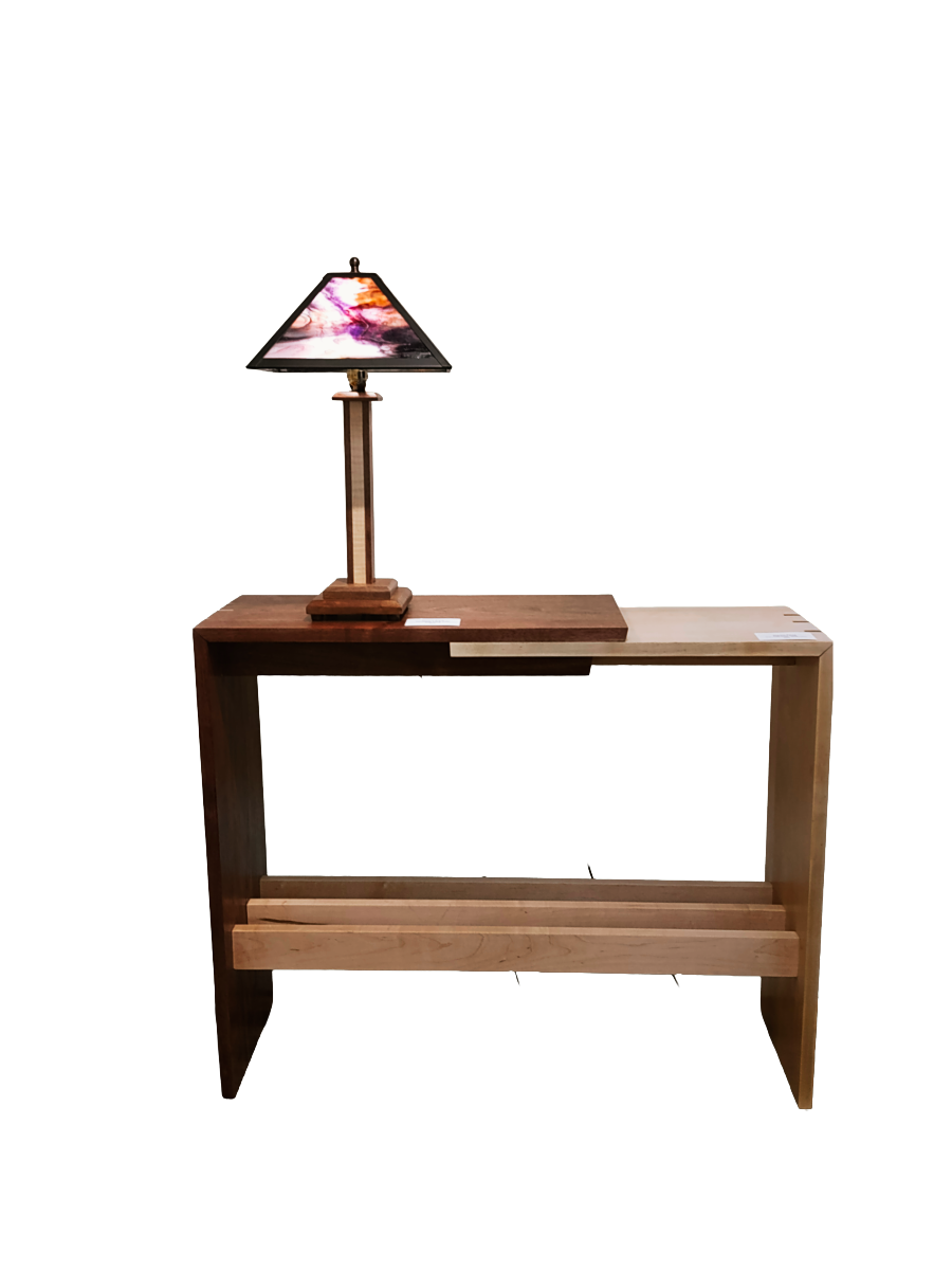 He attended a two-week intensive course at the Center for Furniture Craftsmanship in Rockport, Maine. To develop his woodworking skills, he reconfigured an outbuilding on his property to become a woodshop. Since 2016, he has tried his hand at a number of projects including: pedestal for sculpture; work table with pull-out keyboard tray, bedside tables; hall entry table; book rests; side tables; and charcuterie boards. He fell into making wooden lamps with stained glass shades when his younger daughter asked him to build her two bedside tables. When completed, he thought that what those tables really needed was two lamps to go on them.