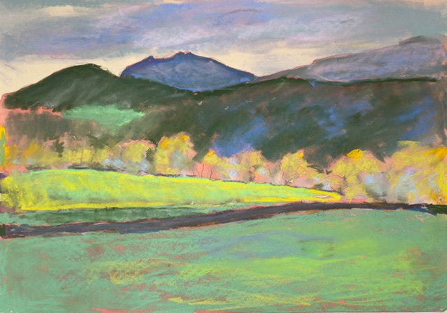 I’ve recently become inspired by a visit to Hoopers’ Island which is near the Blackwater Wildlife Refuge on the Eastern Shore of Maryland. The island is sinking into the Chesapeake and consists of beautiful marshland and a few abandoned houses. I usually sketch the scene on location, take a photo, and proceed to do a value study in pencil. I actually paint the scene in my studio using watercolor or pastel, sometimes combining the two. The rural countryside in Rappahannock County is a continuing inspiration to me.